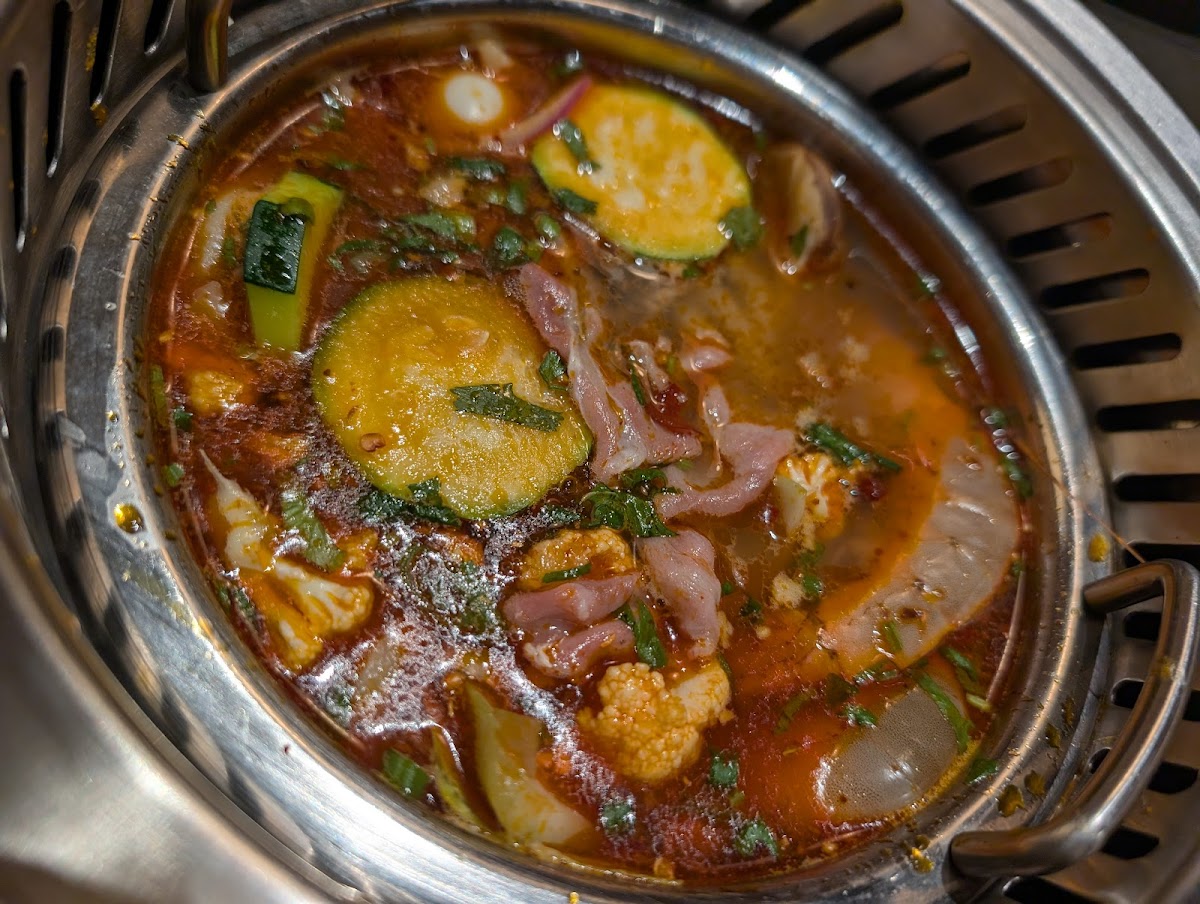 “ Delicious hot pot and kbbq spot! If you don’t know how to dine out with Korean BBQ or hot pot I recommend watching a few videos. For the critics: Yes, you do have to cook it yourself, but it’s a communal experience and very fun. Full disclosure: we drive a hour and twenty minutes for this place every other week. We travel often and try to eat hot pot with every trip out of state; this is in our top 3 hot pot places! Recommend the tonkotsu (pork) soup base. Tons of sauce selections at the bar for you to customize your own experience. Hot food at the bar is actually good; they seem to put out smaller batches of it so it has been consistently fresh for us. BBQ options are phenomenal. Love the strip loin, shrimp, and chicken. Hot pot options are top tier. The hot pot rolled meats are great quality. Everything is fresh and constantly tended. Try the quail eggs! They have recently improved their vegetable selection which is a big deal for us since my wife eats mostly vegetarian. The last time we came (pre improvement) the manager (I believe she’s a manager) actually went to the back and got us additional vegetables. Since then it seems they’ve expanded the selections and we are thrilled with it. Service is consistently good. Wait staff is friendly and very helpful. Suggestion to management: we love your sauce bar! If you see room for it, we’d love a peanut paste/sauce addition! The sesame is great, but we love a good peanut-based sauce. ”