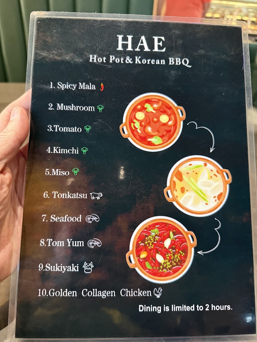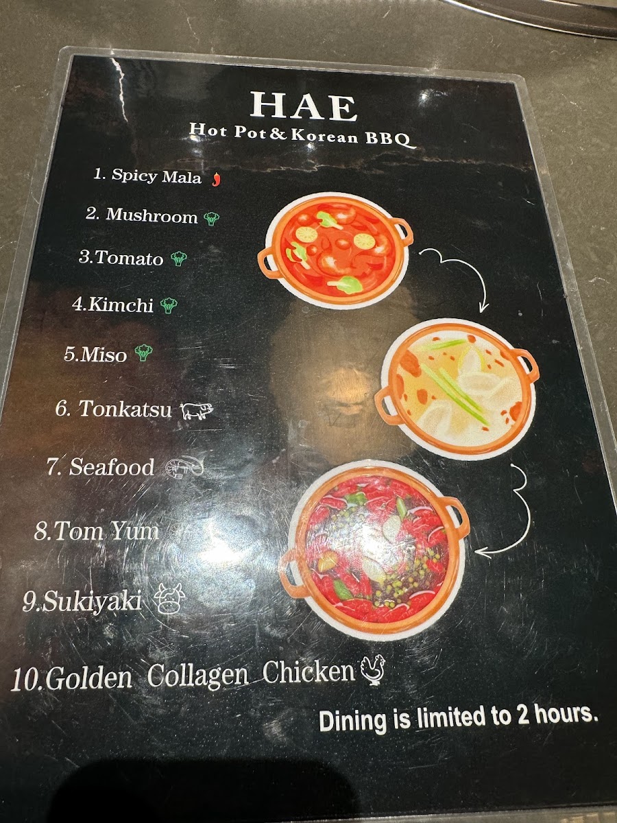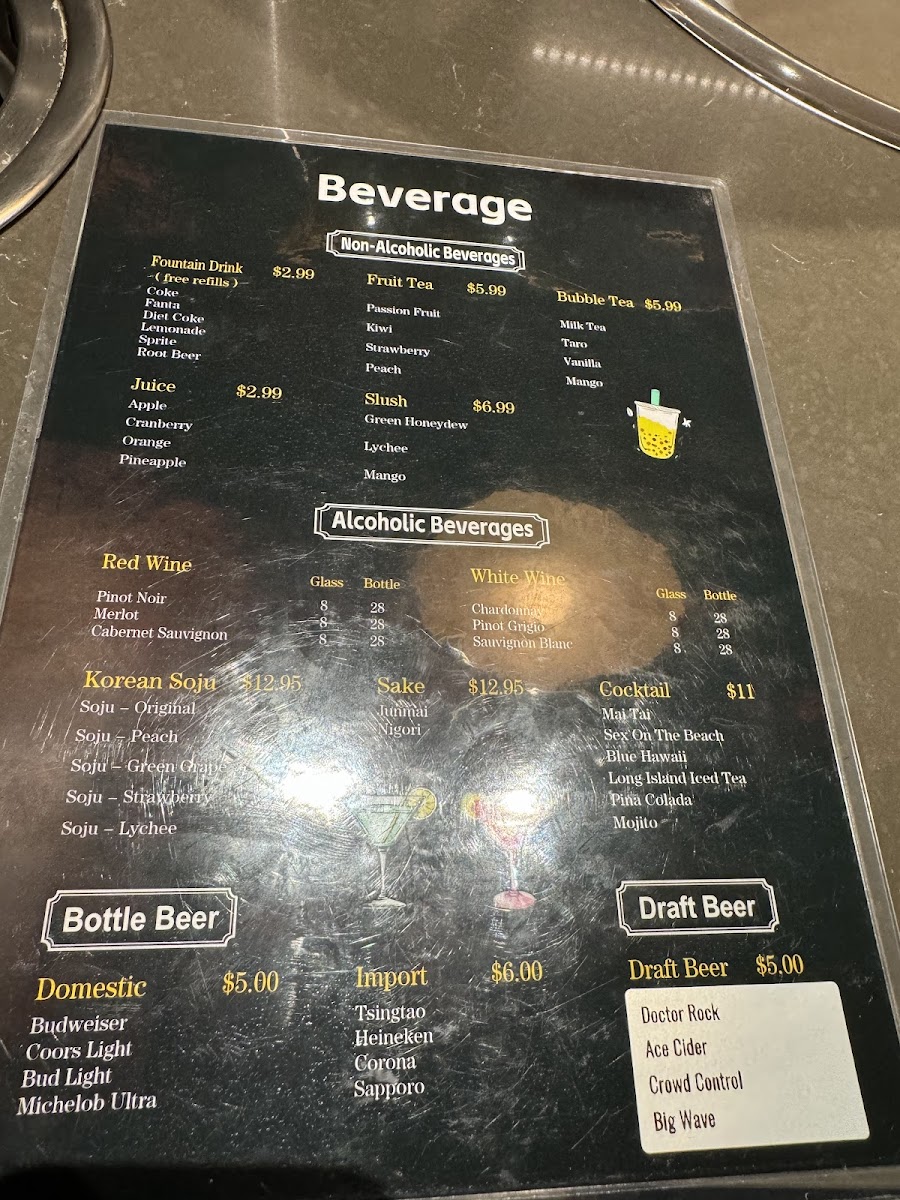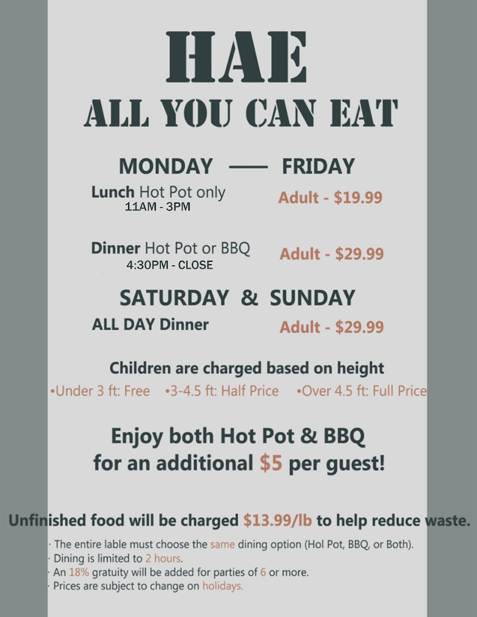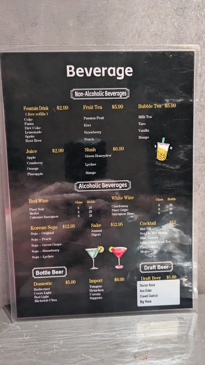 At Hae Pot Korean Barbecue Restaurant, the menu offers a delightful mix of beverages to complement your meal. For wine lovers, there’s a selection of Red Wine options like Merlot and Cabernet Sauvignon, as well as refreshing White Wine choices including Chardonnay, Pinot Grigio, and Sauvignon Blanc. If you're in the mood for something more unique, try the restaurant’s variety of Korean Soju flavors, such as Soju - Original, Soju Peach, Soju Green Grape, Soju - Strawberry, and Soju - Lychee. For a more adventurous drink, the Sake options, particularly the Junmai, provide an authentic touch. Cocktail enthusiasts can enjoy classics like Mai Tai, Sex On The Beach, Blue Hawaii, Long Island Iced Tea, and Pina Colada. Those seeking beer will find a variety of choices from Domestic brands like Budweiser, Coors Light, Bud Light, and Michelob Ultra, to Imported selections like Tsingtao, Heineken, Corona, and Sapporo. Draft beer options such as Doctor Rock, Ace Cider, Crowd Control, and Big Wave are also available for a refreshing experience. For non-alcoholic beverages, options include Apple, Cranberry, Orange, Pineapple, and Coke. Special dining options are offered throughout the week: Monday features a Lunch Hot Pot Only menu, while Saturday & Sunday bring an All Day Dinner experience. Whether you’re looking to enjoy a relaxed drink or dive into a flavorful hot pot, Hae Pot Korean Barbecue Restaurant offers something for every palate.